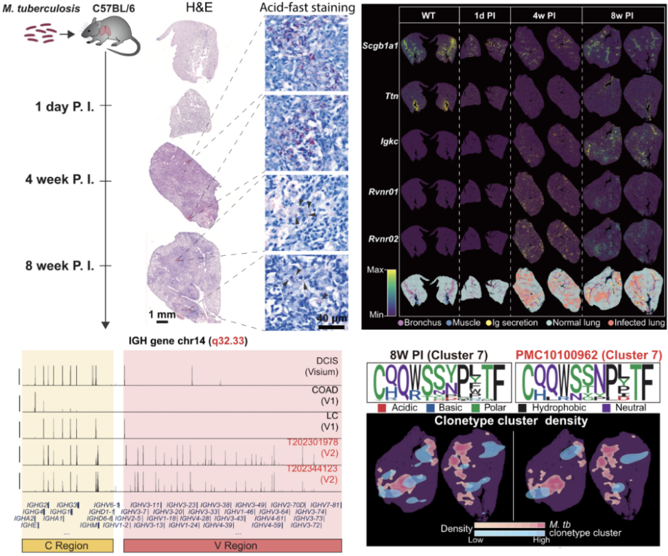 如果说前两个突破是“升级工具”,那第三个突破就是 “改变研究范式”——Stereo-seq V2能在不预设目标的情况下,同时观察人体细胞(宿主)和微生物的基因活动,就像给科学家提供了一张“超高分辨率战场实时地图”。在感染性疾病(比如结核病)或肿瘤中,人体细胞与微生物(或癌细胞)的互动,就像一场复杂的“战争”:传统技术要么只能看到“我方阵地”(宿主细胞),要么需要提前知道“敌人是谁”(比如提前设计针对结核杆菌的探针),才能找到目标,容易造成“盲人摸象”的局面。而Stereo-seq V2完全不用“提前备课”。在对结核病的研究中,团队用它清晰看到了结核杆菌在小鼠肺部的“活动轨迹”——哪里聚集得多、哪里在扩散;更关键的是,他们还发现了一群“特种部队”——专门对抗结核杆菌的特异性B细胞克隆。这些细胞会聚集在感染灶周围,一边战斗,一边“升级装备”(也就是抗体亲和力成熟,让抗体更精准地攻击细菌)。这个发现直接为结核病疫苗和抗体药物研发提供了“精准靶标”。